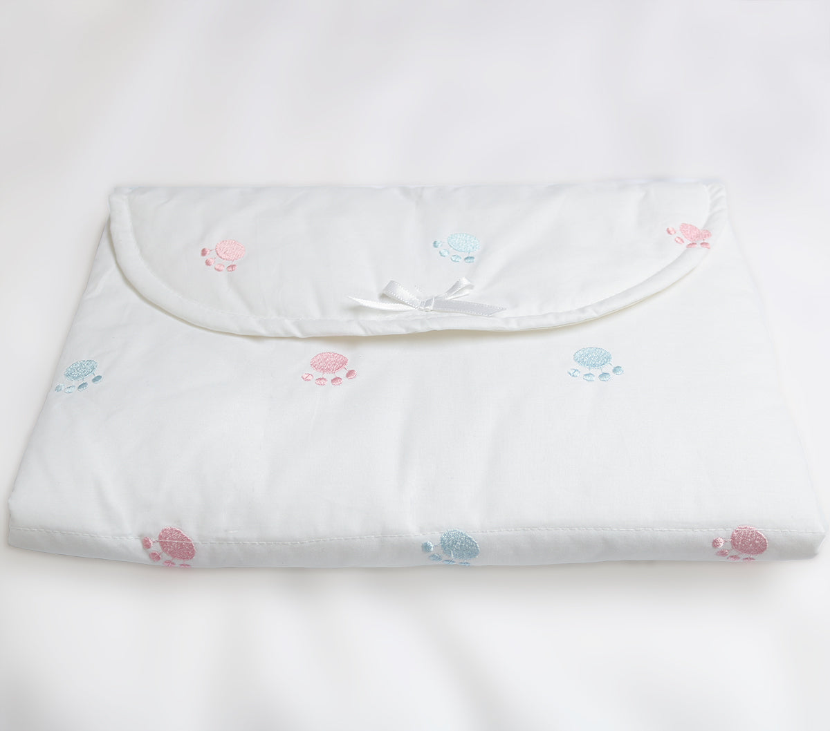 These baby sleeping bags from our Footprints range feature a bright and colourful embroidered footprints pattern and are made with 200 thread count percale cotton. They are available in two sizes for ages 0-6 and 6-18 months. Simple to change with zip opening and poppers around the shoulders and with arm openings to allow good air circulation, these sleeping bags are light weight and suitable for all year round. Changing mats and cot bumpers are also available in this range.